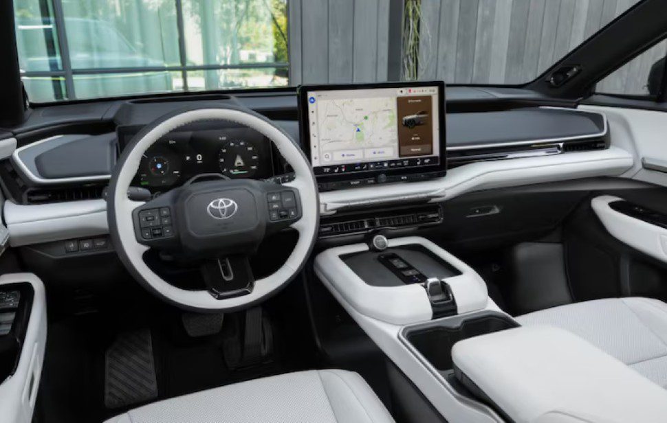 Wie goed kijkt, ziet dat dit eigenlijk de productieversie is van de eerder getoonde bZ Large SUV-concept. Het bekende Toyota EV-front is aanwezig: strak, dicht, modern. Verzonken portiergrepen, een brede LED-lichtbalk achter en daaronder nog een extra set lampen voor wat visuele diepte. Geen schreeuwerig design, maar strak en zelfverzekerd. Binnenin is het digitaal feest zonder dat het klinisch wordt. Een 14-inch infotainmentscherm staat centraal opgesteld, achter het stuur zit een 12,3-inch digitaal instrumentarium. Groot, duidelijk en precies wat je verwacht in dit segment.