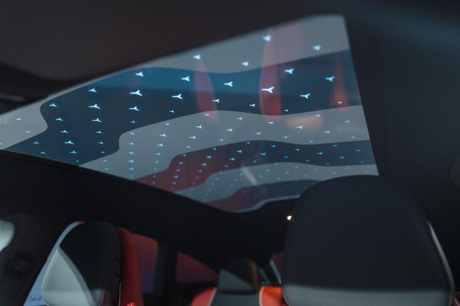 Dat panoramadak is tevens elektrochromisch. Dat wil zeggen dat het in zeven segmenten kan schakelen tussen transparant en mat. Optioneel zijn 158 verlichte sterren in het dak. Denk Rolls Royce starlight, alleen zit er hier ook een ster in je grill. En het is opnieuw een detail dat je niet per se nodig hebt, maar waar Mercedes wel plezier in heeft.