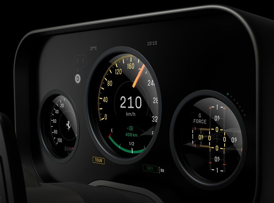 Achter het stuur geeft het instrumentencluster de impressie van drie klokken. In werkelijkheid is het een 12,04-inch Samsung OLED-scherm, geplaatst achter een 12,86-inch scherm. Het maken van drie ronde uitsparingen in een scherm bleek een enorme uitdaging, maar het is gelukt. De oranje naald in het centrale scherm is verbonden aan een ring zodat in het midden de snelheid digitaal kan worden getoond. Dankzij het gebruik van een klassiek letter- en cijfertype en veel geel passen de schermen uitstekend in een Ferrari.