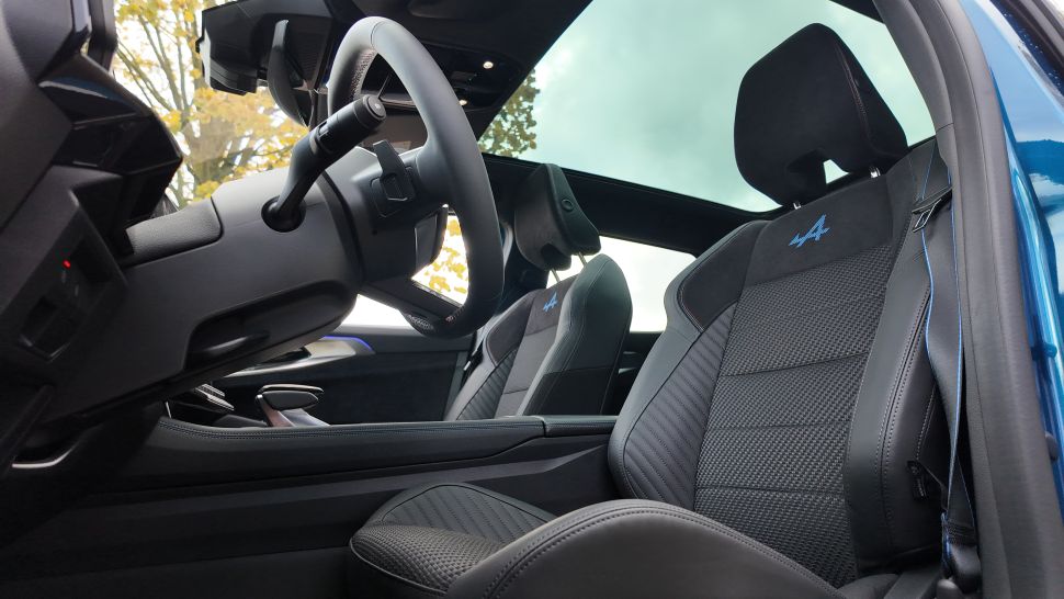 Binnenin vinden we een erg mooi en comfortabel interieur. De stoelen zijn fraai bekleed en voorzien van stiksels in de kleuren van de Franse vlag, hoe kan het ook anders. Bovendien zitten ze heerlijk: lange ritten zijn een stuk aangenamer omdat je lichaam constant goed ondersteund is. De zitpositie is ook uit de kunst; het stuur is ruim verstelbaar en ligt prettig in de hand.
