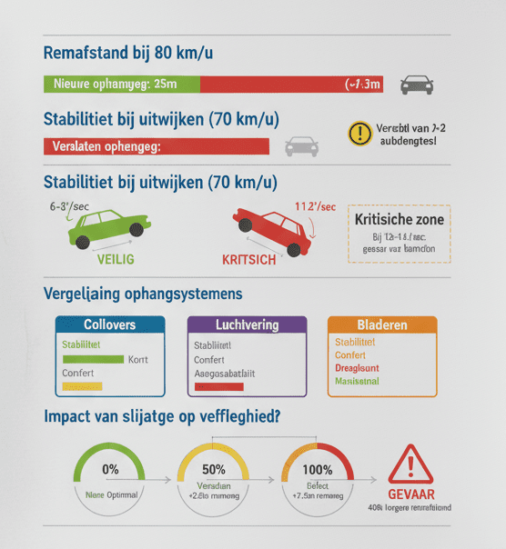 De onderstaande infographic maakt duidelijk hoe dramatisch het verschil is tussen nieuwe en versleten ophanging. Bij 80 km/u heb je met versleten dempers 7,6 meter méér nodig — dat zijn twee tot drie autolengtes extra. De rolhoek van 11,2 graden per seconde bij versleten systemen ligt gevaarlijk dicht bij het kantelpunt van 12-14 graden waar auto’s kunnen omslaan bij noodmanoeuvres. Moderne coilovers houden de rolhoek typisch onder 8 graden, wat aanzienlijk meer controle geeft. De infographic toont ook waarom luchtvering uitblinkt in aanpasbaarheid terwijl bladeren de hoogste draagkracht bieden.