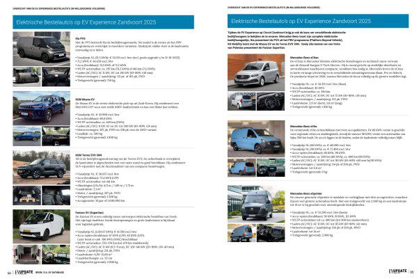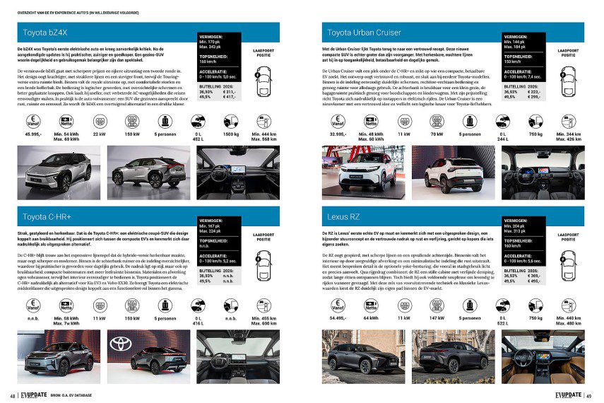 De redactie benadrukt dat het magazine meer biedt dan tabellen met cijfers. Uit de vele fabrieksspecificaties worden juist die details geselecteerd die in de praktijk verschil maken: de bruikbare actieradius, laadsnelheden, accucapaciteit en de kosten die bij dagelijks gebruik komen kijken. Voor wie meer wil weten, zijn er op evupdate.nl uitgebreide rijtesten beschikbaar. Zo wordt de brug geslagen tussen een papieren gids en online database.
