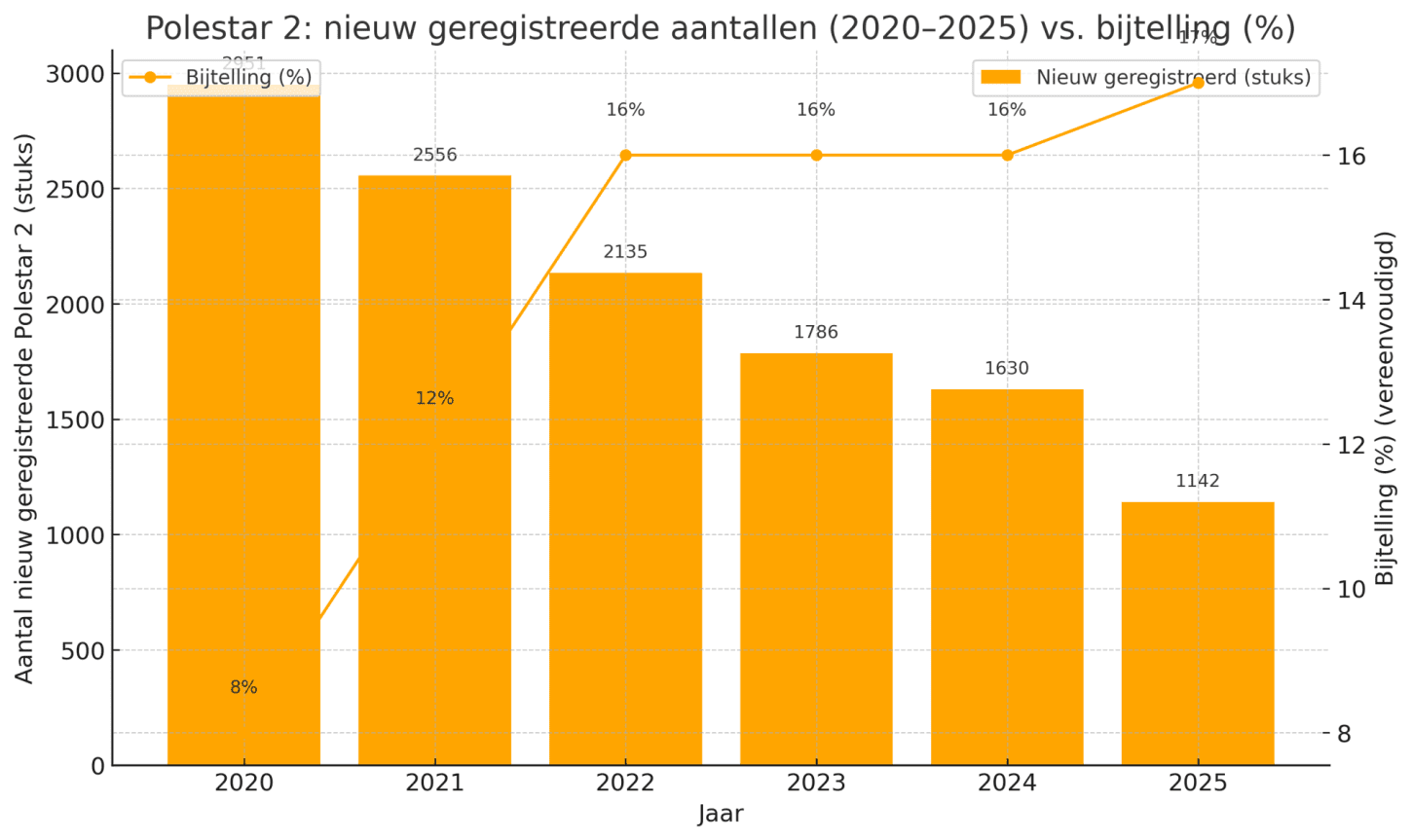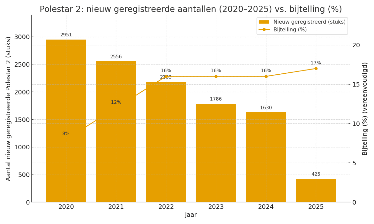 De gemiddelde catalogusprijs ligt rond de € 56.250, waarmee de Polestar 2 zich in het midden van het premiumsegment positioneert. De verkopen liepen na 2021 langzaam terug, parallel aan de afbouw van fiscale voordelen en de komst van nieuwe concurrenten. Toch laat 2025 tekenen van herstel zien, tot begin september al ruim 425 nieuwe registraties – een beter ‘ritme’ dan in dezelfde periode van 2024.