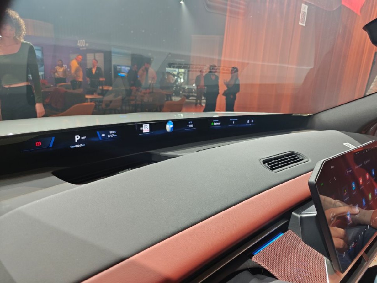 Oké, we geven toe: het zijn slechts twee schermen. Een daarvan is natuurlijk het infotainmentscherm. De auto’s die op de show staan, zijn preproductiemodellen. Dat betekent dat de kwaliteit nog niet op het niveau is dat BMW graag in productie neemt. Althans, dat wordt gezegd, maar de reactiesnelheid, helderheid, kleuren en animaties zijn allemaal van hoog niveau. Wat hier nog aan verbeterd zou moeten worden, mag Joost weten. De vorm vinden we leuk; alsof het naar de rijder toe getrokken is. Dit scherm is leuk, maar recht voor je ogen zit er een dat nog indrukwekkender is.