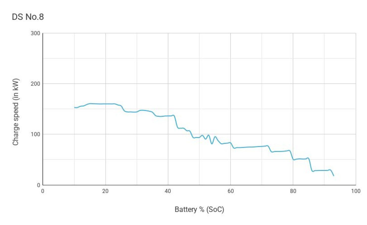 Tijdens het snelladen laat de DS NO8 zien dat hij zijn grote accu redelijk goed weet te benutten. Eerst laadt hij met ruim 160 kilowatt, maar al snel toen de accu voller raakt zakte de laadsnelheid flink terug. Dat is goed te zien in de laadsessie die we hebben vastgelegd: tot veertig procent blijft de snelheid hoog, daarna neemt het tempo stap voor stap af. In de praktijk betekent dit dat je in ongeveer een half uur weer zo’n driehonderd kilometer rijbereik toevoegt. We hebben in de week dat we reden de NO8 niet helemaal onder optimale omstandigheden kunnen testen. Dat had meer te maken met het netwerk dan met de auto. Toch geeft het een beeld. We hadden min of meer toch iets meer verwacht. 800 volt met dito laadsnelheid had deze limousine goed gestaan.
