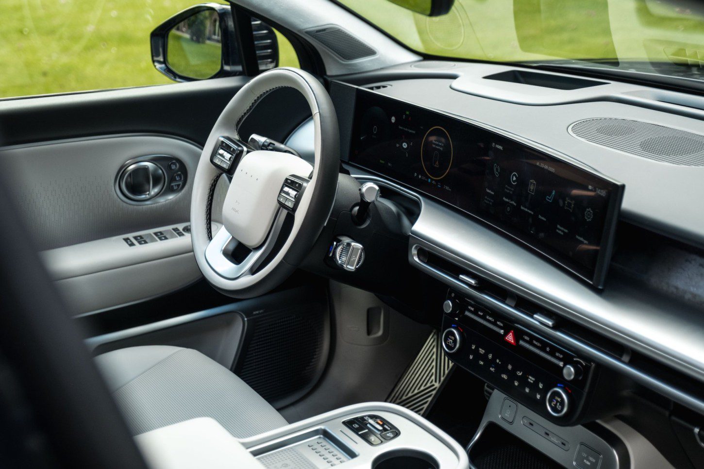 In het dashboard van de IONIQ 9 prijkt een breed, gecurveerd panoramisch scherm dat twee 12,3-inch displays herbergt voor het instrumentarium en infotainment. Dit oogt futuristisch, maar is ook functioneel: de bediening van navigatie, audio en voertuigfuncties werkt vlot en er is nog een head-up display voor de belangrijkste info, zodat je je ogen op de weg kunt houden. Hyundai rust de IONIQ 9 uit met over-the-air updates, waardoor software en navigatie altijd actueel zijn. Digital Key 2.0 maakt het mogelijk de auto te openen en starten met je smartphone als sleutel. Uniek is de introductie van de Hyundai AI Assistant: als eerste model van het merk heeft de IONIQ 9 een spraakassistent die complexe opdrachten kan uitvoeren en zo de bediening verder vereenvoudigt. Dit past bij de hightech uitstraling van de auto, zonder dat het overweldigend wordt. De interface blijft gebruiksvriendelijk en logisch.