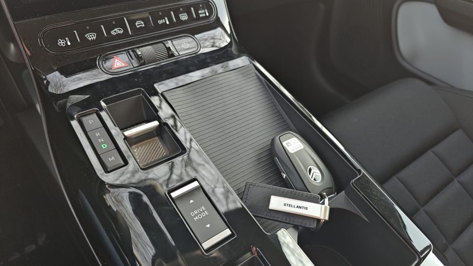 Een druk op de prominente start/stopknop wekt de motor tot leven. Dat gebeurt met meer mechanisch enthousiasme dan verwacht van zo’n compacte krachtbron. Na enkele seconden keert de rust terug, reden tot zorg is er dus niet. Via de typische Stellantis‑rijmodi-schakelaar wordt van ‘P’ naar ‘D’ geschakeld en kan de rit beginnen.