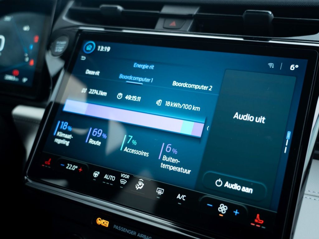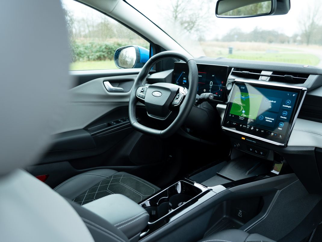 Wanneer we plaatsnemen achter het grote, ‘vierkante’ stuur (boven- en onderkant zijn afgevlakt) kijken we naar een geheel nieuw ontworpen dashboard. Hierin maken twee grote digitale displays de dienst uit. Over de overzichtelijkheid van het instrumentarium hebben we weinig klachten, over de bedienbaarheid van het centrale scherm evenmin. De menustructuur van het bedieningssysteem steekt logisch in elkaar, het kost weinig tijd om aan eraan gewend te raken. We foeteren wel eens op auto’s waarbij ook de aircoknoppen in het centrale touchscreen zijn ondergebracht. Dat is bij de Puma Gen-E eveneens het geval, maar de verschillende functietegels zijn logisch gerangschikt en blijven onder in het scherm altijd zichtbaar. Een prima oplossing, wat ons betreft. Met een hendel rechts aan de stuurkolom bepaal je de rijrichting, net zoals in de Ford Explorer en Capri (met dank aan Volkswagen).
