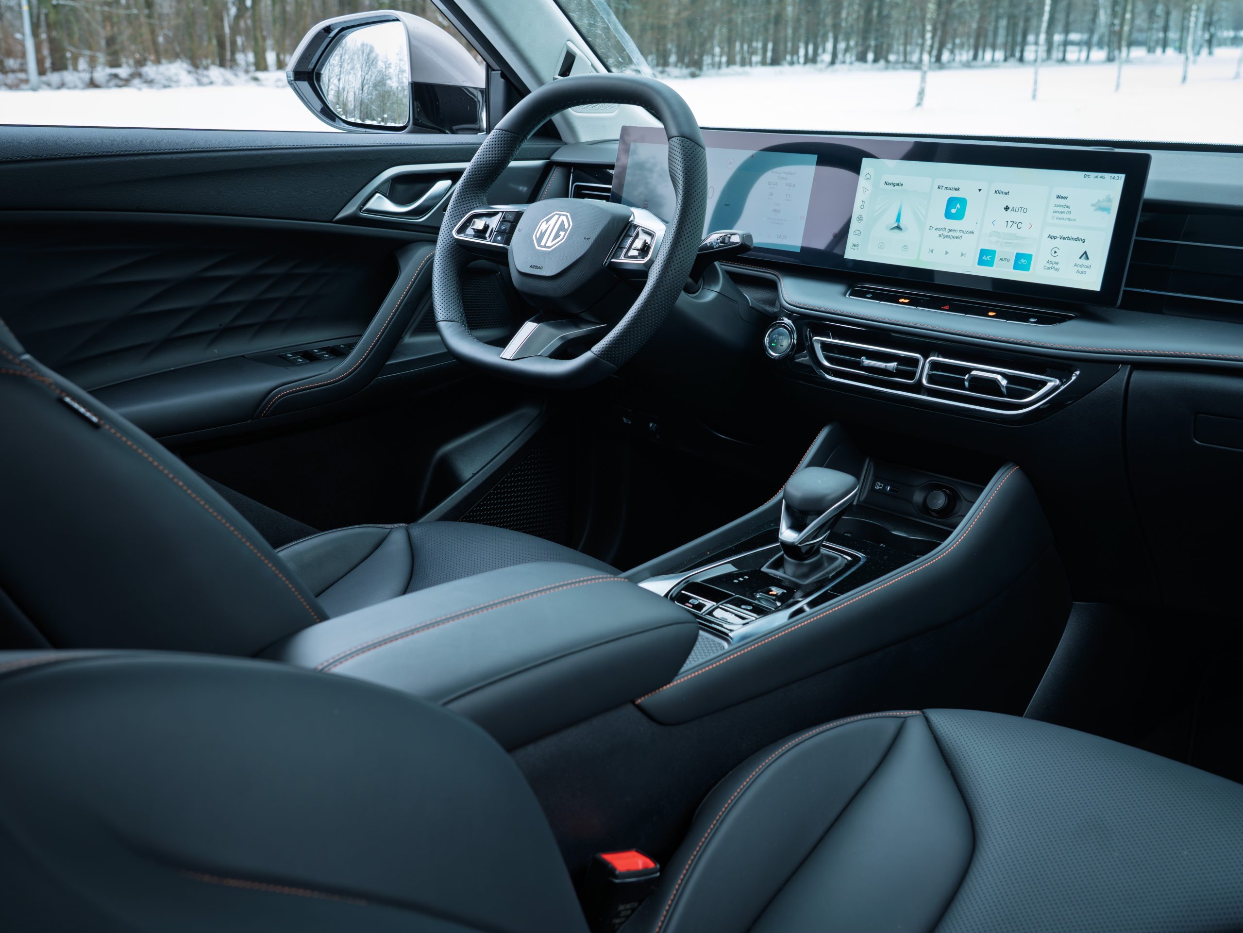 Ook vanbinnen is er weinig mis met de MG HS Hybrid+. Onze testauto is uitgevoerd als meest complete Luxury, en dat betekent zacht kunstleer voor het meubilair. In de deurpanelen zien we een Lexus-achtig golfpatroon, een koperkleurige draad geeft het zwarte geheel een vrolijk accent. En ook al zien we hier en daar een strookje hard plastic, het geheel is netjes afgewerkt. Voor het breedbeeld-instrumentarium geldt: ook dat hebben we eerder gezien. Hier moet je zijn voor alle belangrijke functies. Zodra je verder dan de homepage van het infotainmentsysteem swipet en scrollt, is het even zoeken waar alles zit. Het kleine formaat van de icoontjes maakt de bediening er niet eenvoudiger op, terwijl de reacties op onze input soms meer tijd kosten dan ons geduld toelaat.