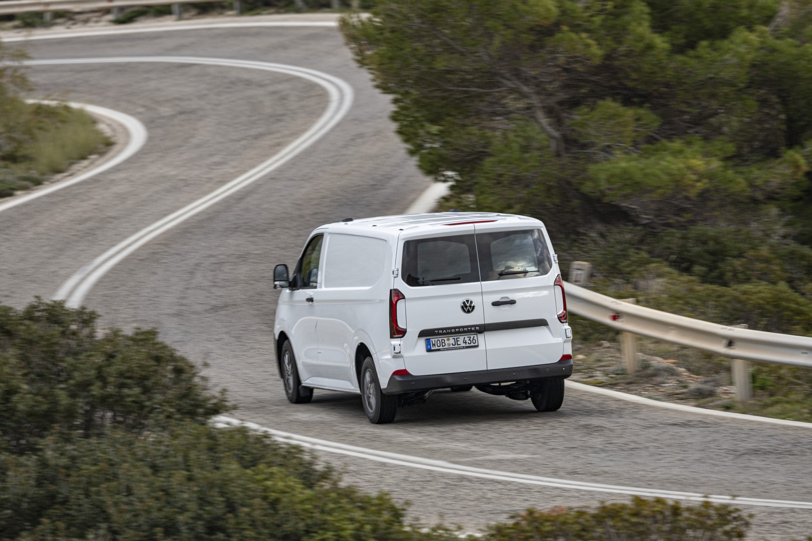 Stap in, druk op de startknop, en je voelt je meteen thuis. Ondanks het gewicht van de accu stuurt de Transporter verrassend soepel en vlot door de bochten. Dat komt niet alleen door de directe besturing, maar ook door de achterwielaandrijving. Doordat de voorwielen geen aandrijftaken hebben, kunnen ze verder indraaien, wat resulteert in een verrassend korte draaicirkel. Handig bij krappe parkeervakken of smalle bouwplaatsen.
